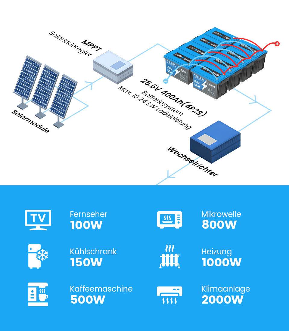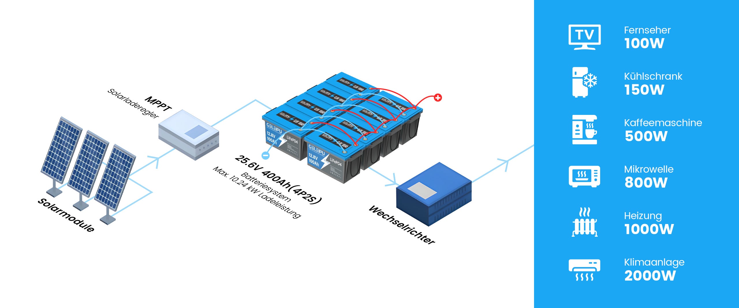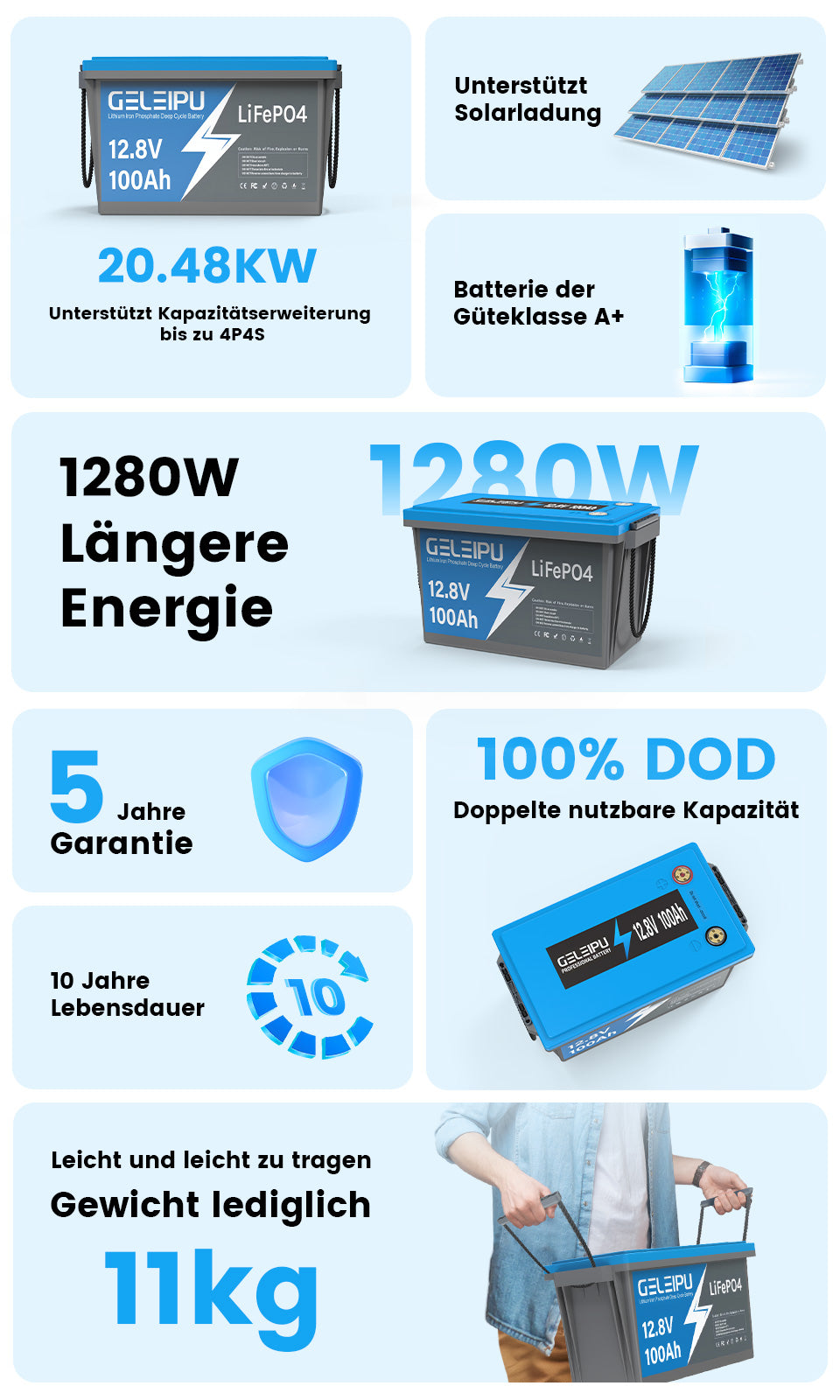 Die Geleipu 12.8V 100Ah LiFePO4-Batterie unterstützt eine flexible Konfiguration, die es ermöglicht, bis zu 4 in Serie und 4 parallel zu schalten (max. 4S4P), um ein leistungsstarkes 51.2V 400Ah-Batteriesystem zu schaffen, das 20.48kWh Energie und eine maximale Lastkapazität von 20.48kW liefert. Ideal für Wohnmobile, Solaranlagen, Energiespeicherung zu Hause und netzunabhängige Anwendungen.