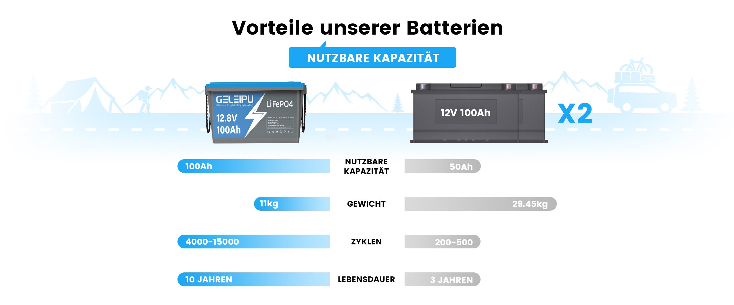 [100% DOD] 12V 100Ah Lithiumbatterien können eine Entladetiefe von 100 Prozent erreichen, während Blei-Säure-Batterien nur 50 Prozent erreichen können. Basierend auf der Entladetiefe und der Lebensdauer ist 1 Geleipu 12V 100Ah = 2 12V 100Ah Blei-Säure-Batterien.Die Geleipu 12V LiFePO4 Batterie unterstützt 100% DOD (4000+ Zyklen @ 100% DOD, 6000+ Zyklen @ 80% DOD, 15000+ Zyklen @ 60% DOD), während die AGM Batterie 50% DOD unterstützt.