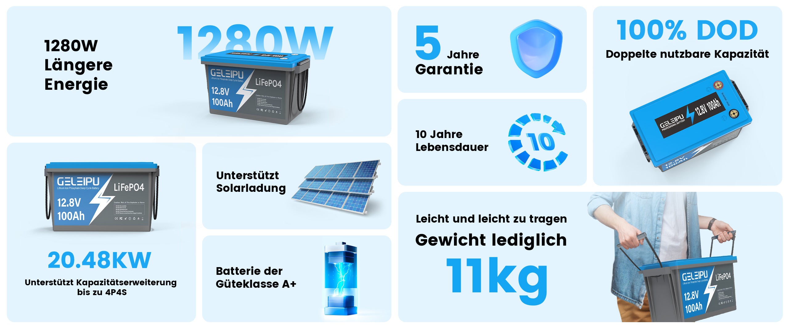 Die Geleipu 12.8V 100Ah LiFePO4 Batterie wurde speziell für Stromversorgungslösungen im Innen- und Außenbereich entwickelt. Die 1280Wh-Kapazität gepaart mit schneller Aufladung macht sie fähig, Ihre verschiedenen Bedürfnisse zu erfüllen. Das geringe Gewicht und die kleine Größe Design macht es einfach für Sie zu tragen und zu installieren.