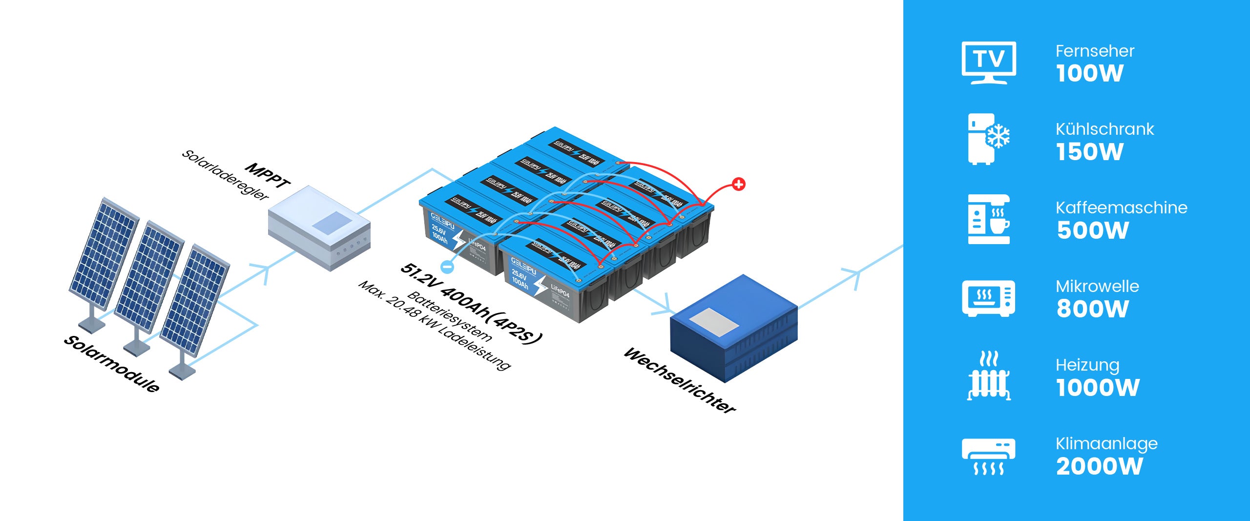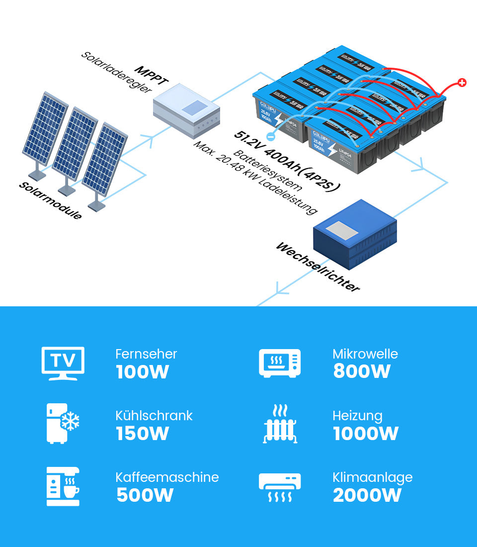 Die Geleipu 25.6V 100Ah LiFePO4-Batterie unterstützt eine flexible Konfiguration, die es ermöglicht, bis zu 4 in Serie und 4 parallel zu schalten (max. 4S4P), um ein leistungsstarkes 51.2V 400Ah-Batteriesystem zu schaffen, das 40.96kWh Energie und eine maximale Lastkapazität von 40.96kW liefert. Ideal für Wohnmobile, Solaranlagen, Energiespeicherung zu Hause und netzunabhängige Anwendungen.