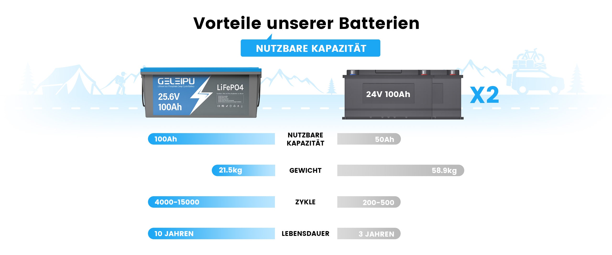 [10 Jahre Lebensdauer] Geleipu ist mit hochwertigen LiFePO4-Batterien ausgestattet, die eine ausgezeichnete Qualität, eine höhere Energiedichte, eine stabile Leistung und eine höhere Leistung gewährleisten. Die LiFePO4-Batterien von Geleipu bieten garantiert 4000+ Zyklen und eine Lebensdauer von 10 Jahren.
